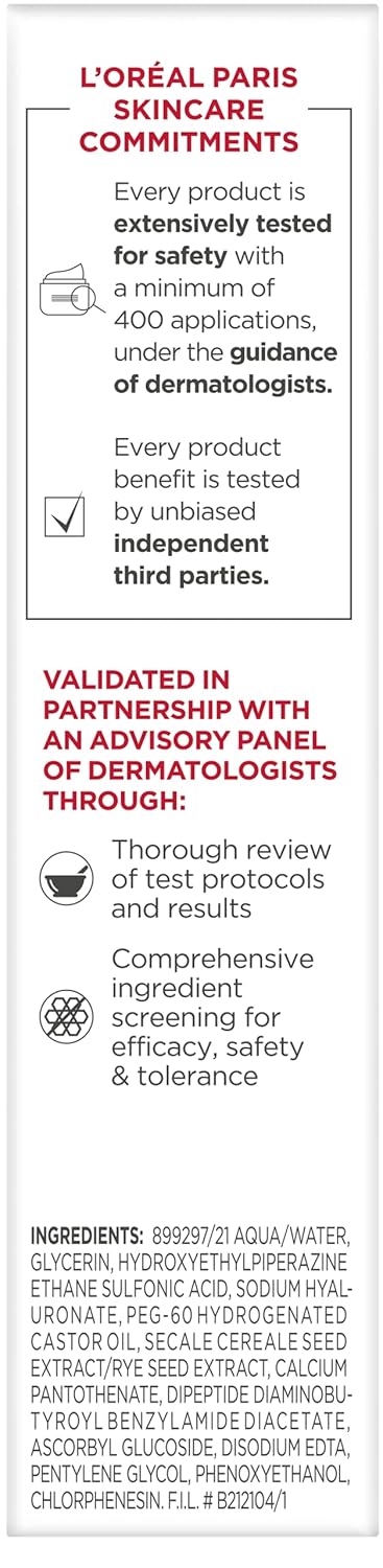 L'Oréal Paris Revitalift 1.5% Hyaluronic Acid Serum is a dermatologist-recommended hydrating serum that visibly plumps, smooths, and deeply hydrates the skin from the first drop. Powered by 1.5% pure hyaluronic acid, this lightweight, fast-absorbing serum penetrates the skin to deliver intense hydration and reduce fine lines, leaving your complexion supple, radiant, and glowing.