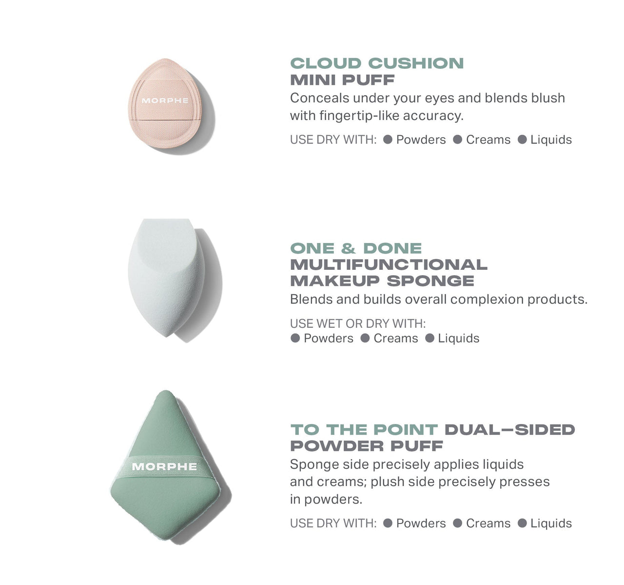 The tools work well with liquid, cream, and powder complexion products such as foundation, concealer, contour, and cream blush.