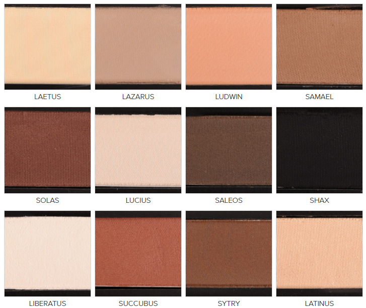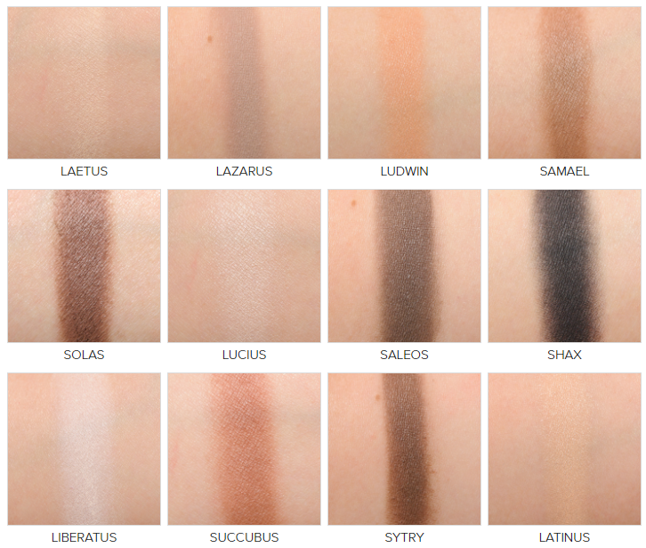 Samael (neutral contour) – described as dusty fawn. It’s a medium grey-tinged brown with a tiny bit of satiny sheen. I really like this shade, but unfortunately it pills up a bit and doesn’t blend as smoothly as some of the other shades in this palette.