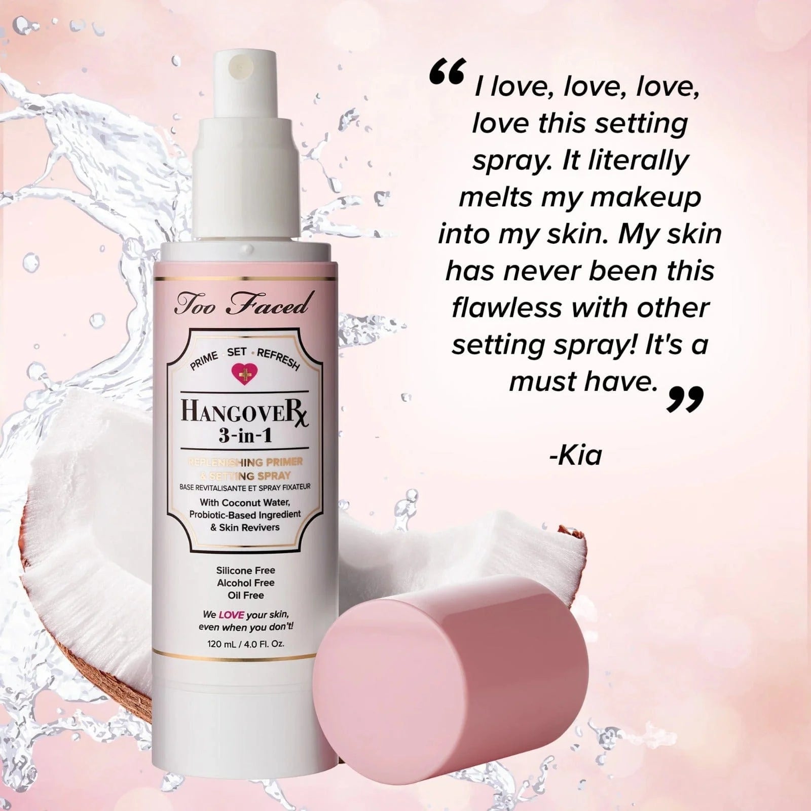 Too Faced Hangover 3-in-1 Primer & Setting Spray is a multi-tasking, weightless mist that primes, sets, and refreshes makeup while hydrating and brightening the skin. Infused with coconut water, probiotic-based ingredients, and skin-loving hydrators, this ultra-fine spray leaves the skin feeling replenished and revitalized.